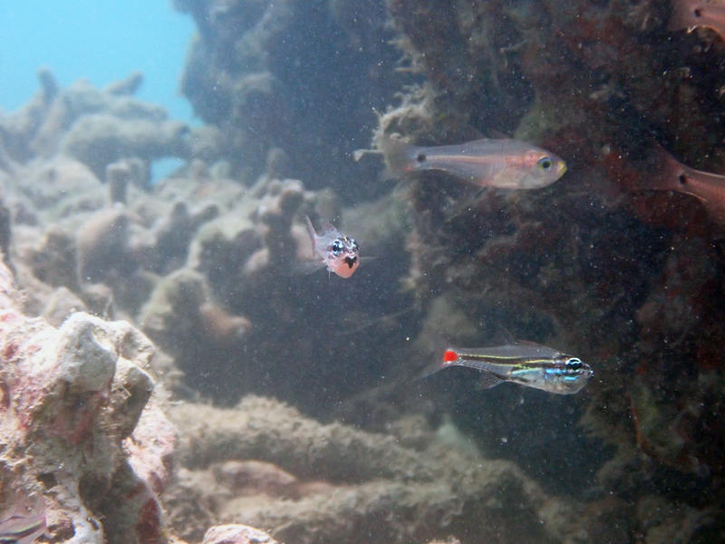 目が青いイトヒキテンジクダイがたくさんいますが、中には口内保育してる子もいるので、よーく観察してみてください。