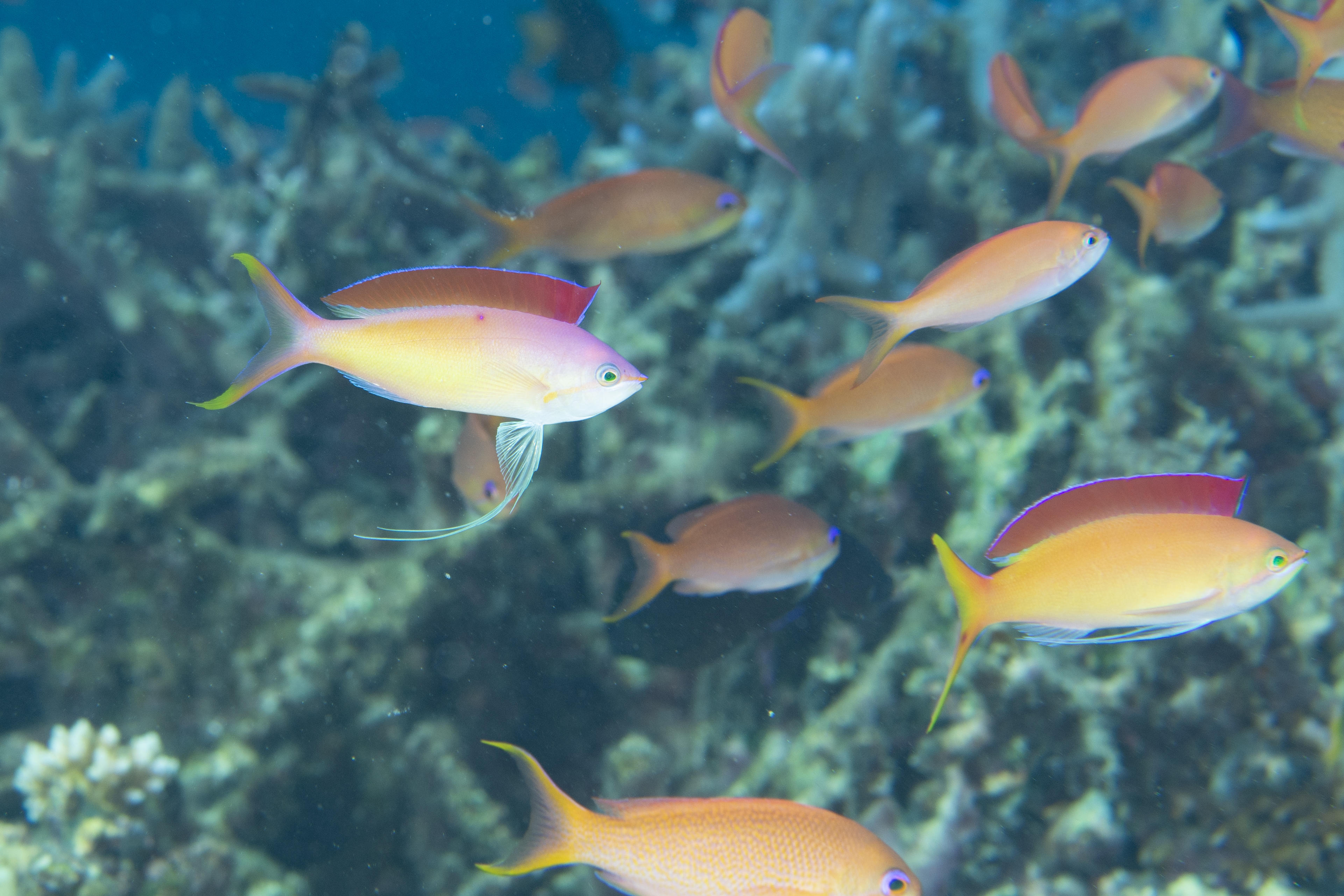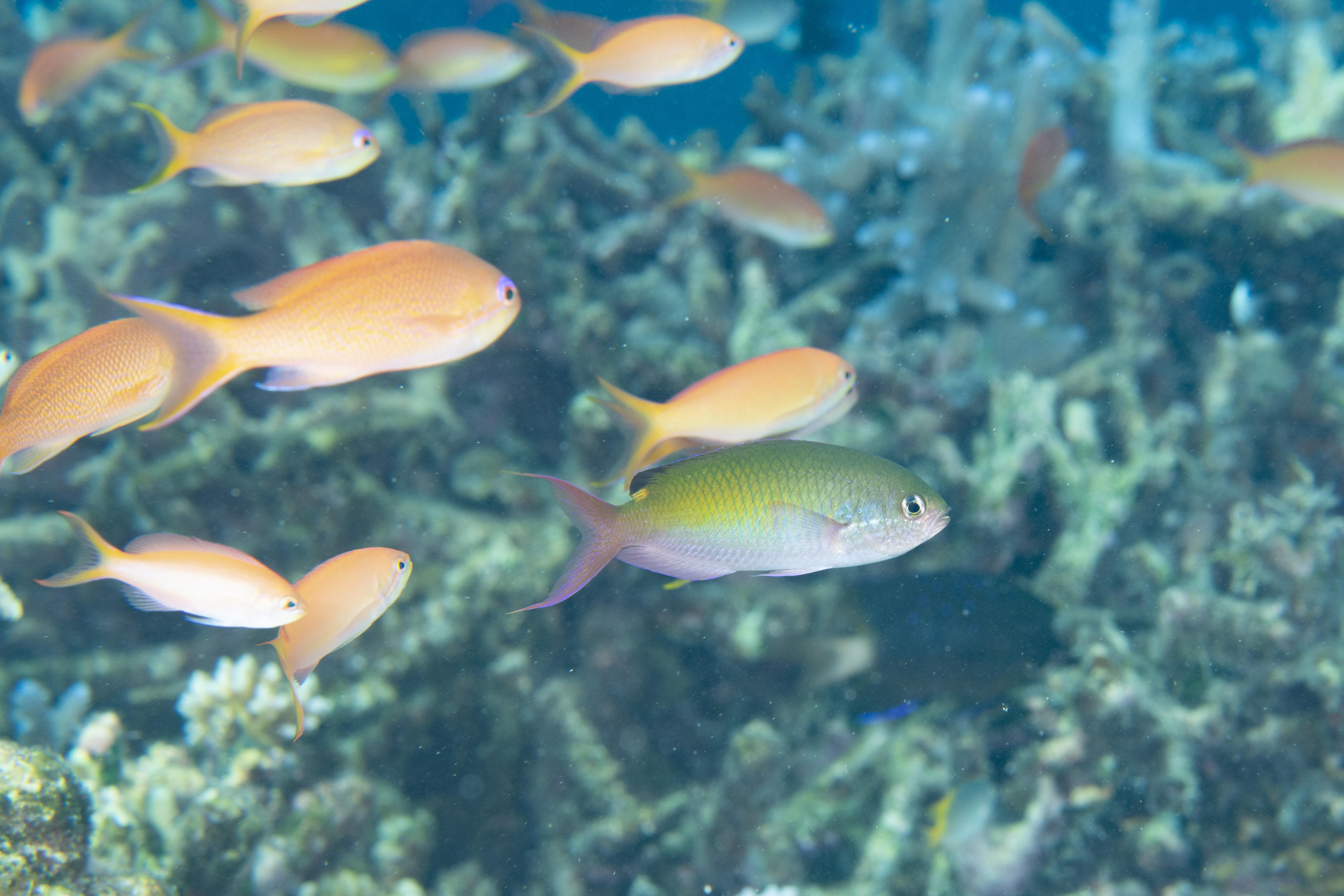 キンギョハナダイ&アカネハナゴイの群れの中に2匹だけ混ざってます